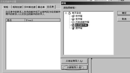 后来,我只好先把真正的垃圾邮件删除,然后在“反垃圾邮件设置”里的“白名单”标签里,点击“从邮箱导入”(如图),直接把电子杂志判作是友好的联系人发送的邮件,这样就跳过了原有垃圾邮件过滤规则。