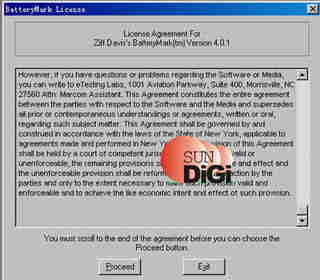 OK,做完了准备工作,就可以开始运行Battery Mark了(先不要拔掉电源),依次点取开始菜单→程序→Ziff Davis Media BenchMarks→Ziff Davis Media Battery Mark 4.0.1,进入下面的License画面。