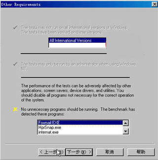 这一页有一个很搞笑的地方,在最上方Battery Mark注明了“此测试程序并不适合于所有的windows版本,此测试在以下版本上进行了校验:所有的windows版本”晕倒,这,这不是自己打自己耳光吗?呵呵……。为了避免测试过程被其它同时运行的程序影响,Battery Mark会自动探测你正在运行的程序,并